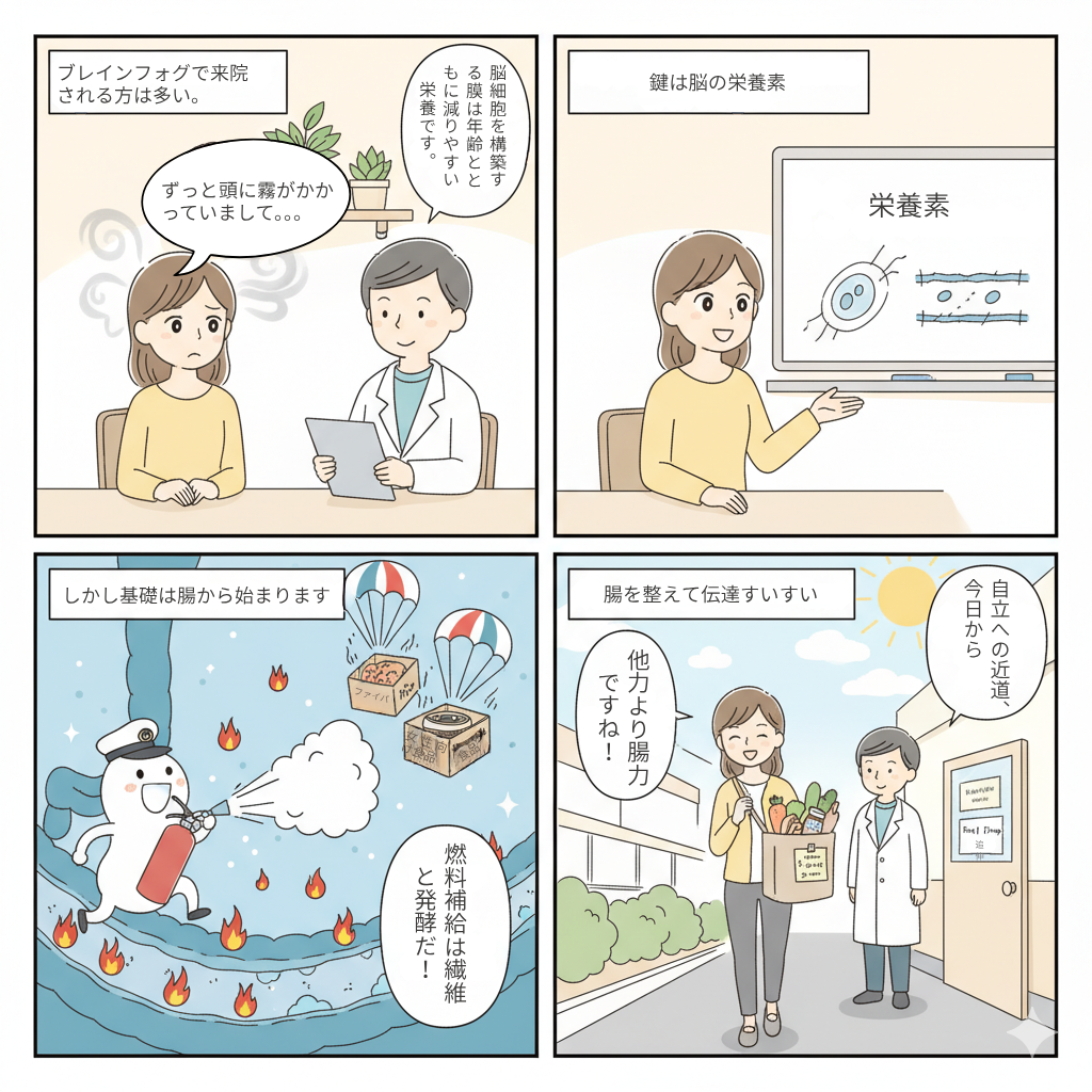 腸と脳は互いにメッセージを送り合う密接な関係(腸脳相関)にあります。腸には「第二の脳」と呼ばれるほど神経細胞が多く存在し、セロトニンなど脳内と同じ神経伝達物質の大半を腸内細菌が産生しています。そのため、腸内環境の乱れはメンタルや認知機能に影響を与え、ブレインフォグの原因となりえます。